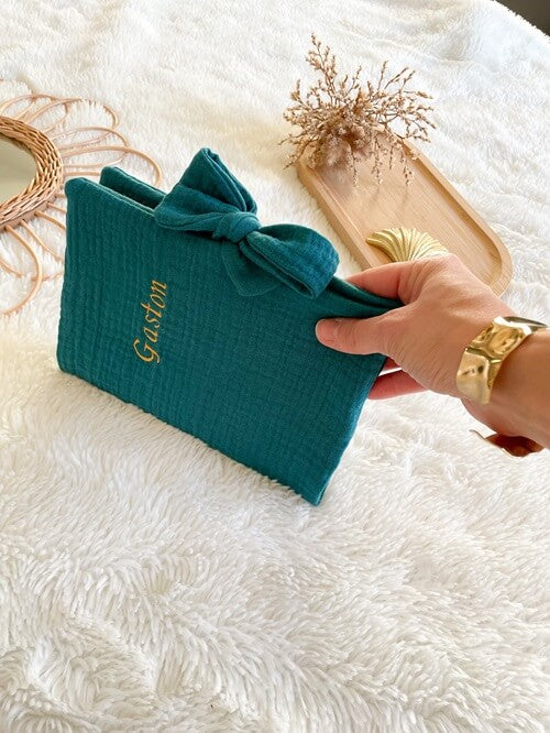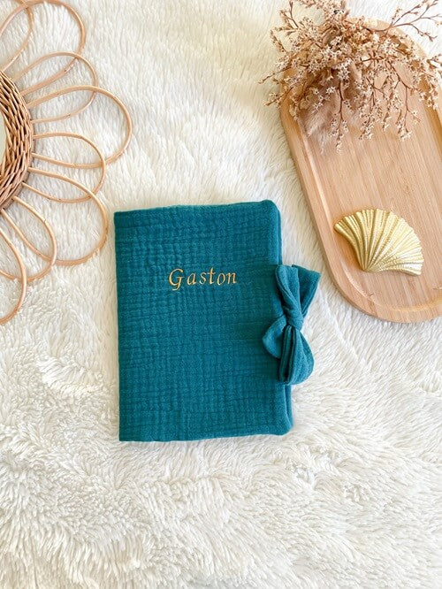 Notre protège carnet de santé en double gaze est l'indispensable à l'arrivée de bébé.