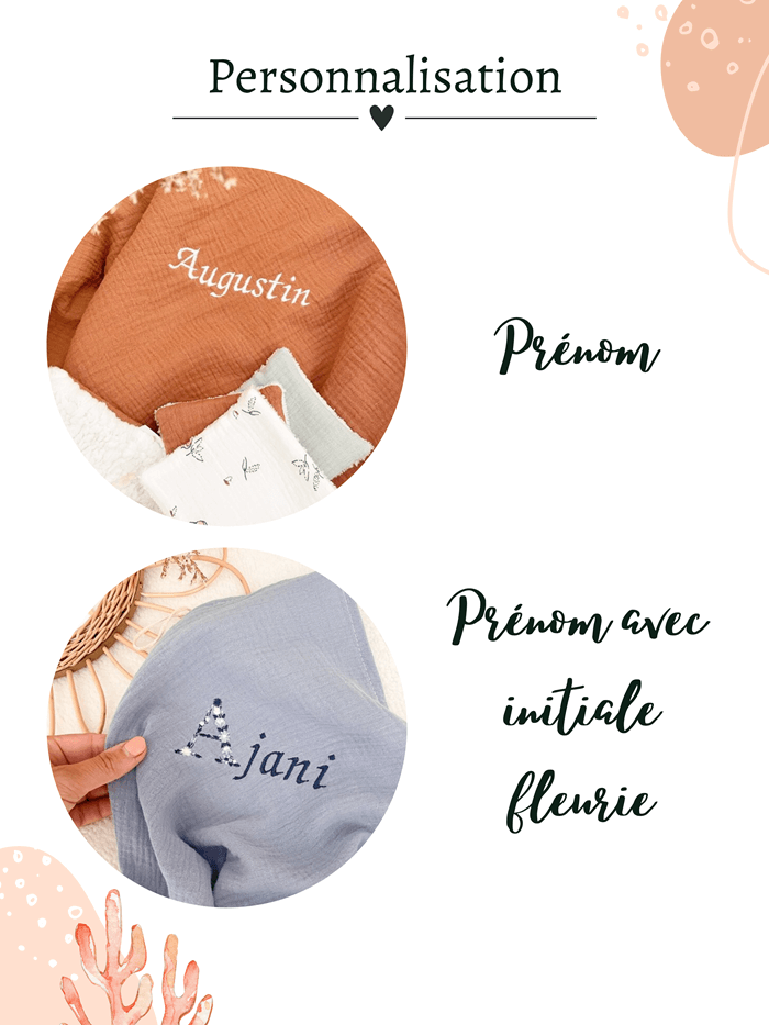 Comme chaque enfant, cette jolie couverture peut être unique et personnalisée du prénom de bébé ou tout autre inscription. La broderie, dont la couleur et police sont au choix, sera positionnée en bas de la couverture.